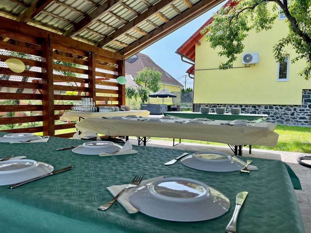 Kerthelyiség tágas, rendezett, melyben a pihenést és a kényelmet napozóágyak, kerti kiülők valamint luxus masszázsélményt biztosító jakuzzi szolgáltatja.