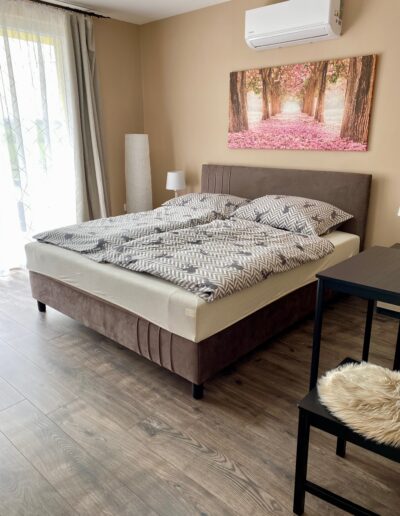 Jelenleg 7 fő befogadására alkalmas önálló ház, melyben rendelkezésre áll egy teraszos, franciaágyas szoba, mely két fő elszállásolására alkalmas.
