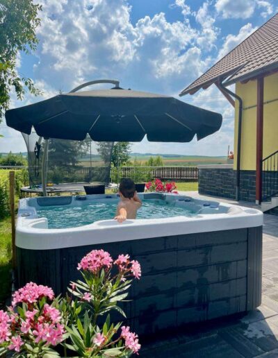 Kerthelyiség tágas, rendezett, melyben a pihenést és a kényelmet napozóágyak, kerti kiülők valamint luxus masszázsélményt biztosító jakuzzi szolgáltatja.